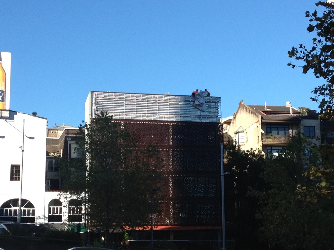 Beginning at sunrise, the acclaimed artists scaled the building with the assistance of a cherry-picker. Armed with nothing but paints and 15 metres of white space, Beastman and Jumbo worked into the afternoon to create two original artworks that will sit above the ‘Art Wall’ building on William Street for the next two weeks.